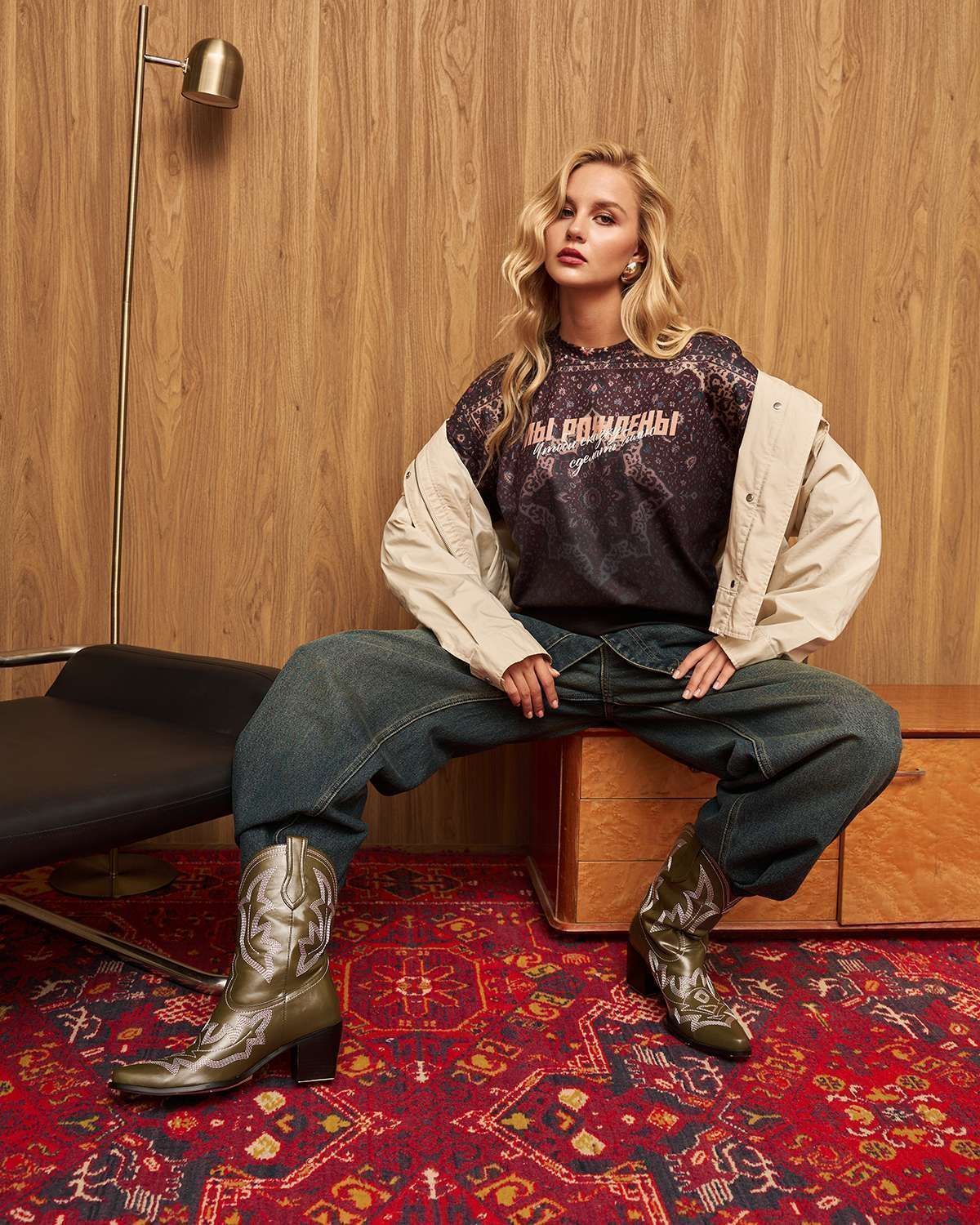 Cвитшот, вдохновленный эстетикой советских времен, сочетающий уютные мотивы традиционного русского быта и современные дизайнерские решения. Центральным элементом изделия является яркая картина советского ковра с характерными орнаментами, наполненная теплыми красками и четкими линиями, придающая вещи неповторимый шарм.