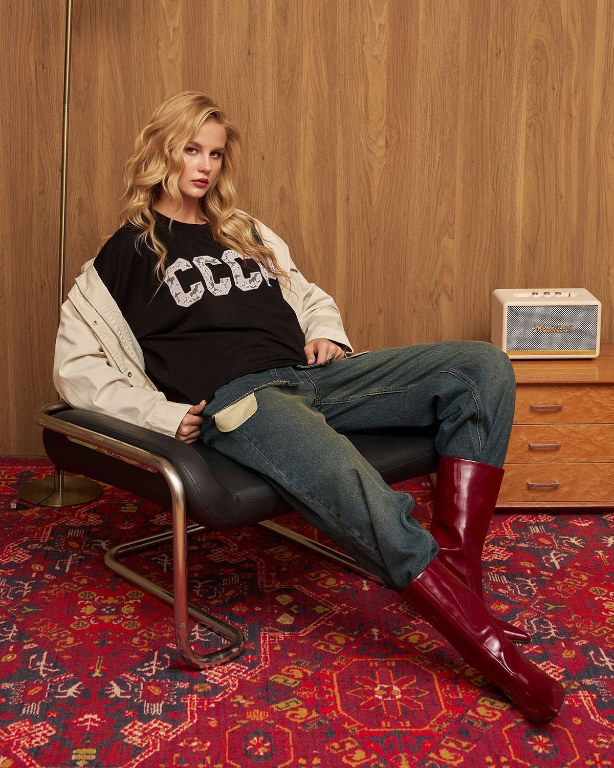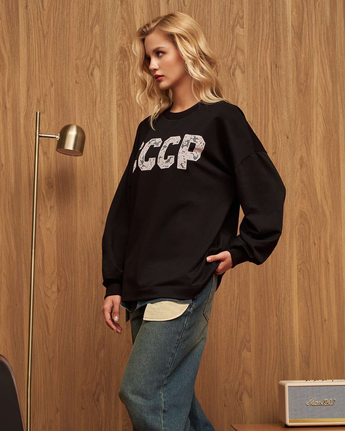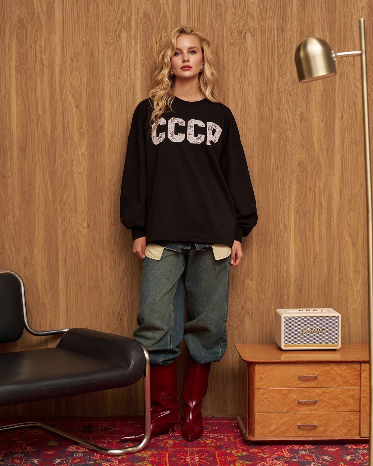 Cвитшот свободного кроя с лаконичной надписью «СССР» станет идеальным дополнением гардероба. Его дизайн сочетает элементы ретро-стиля с современными тенденциями, создавая неповторимый баланс прошлого и настоящего. Просторный силуэт позволяет чувствовать себя комфортно и свободно, идеально подходит для повседневной носки. Аккуратные манжеты на рукавах подчеркивают форму изделия и позволяют регулировать длину рукава.