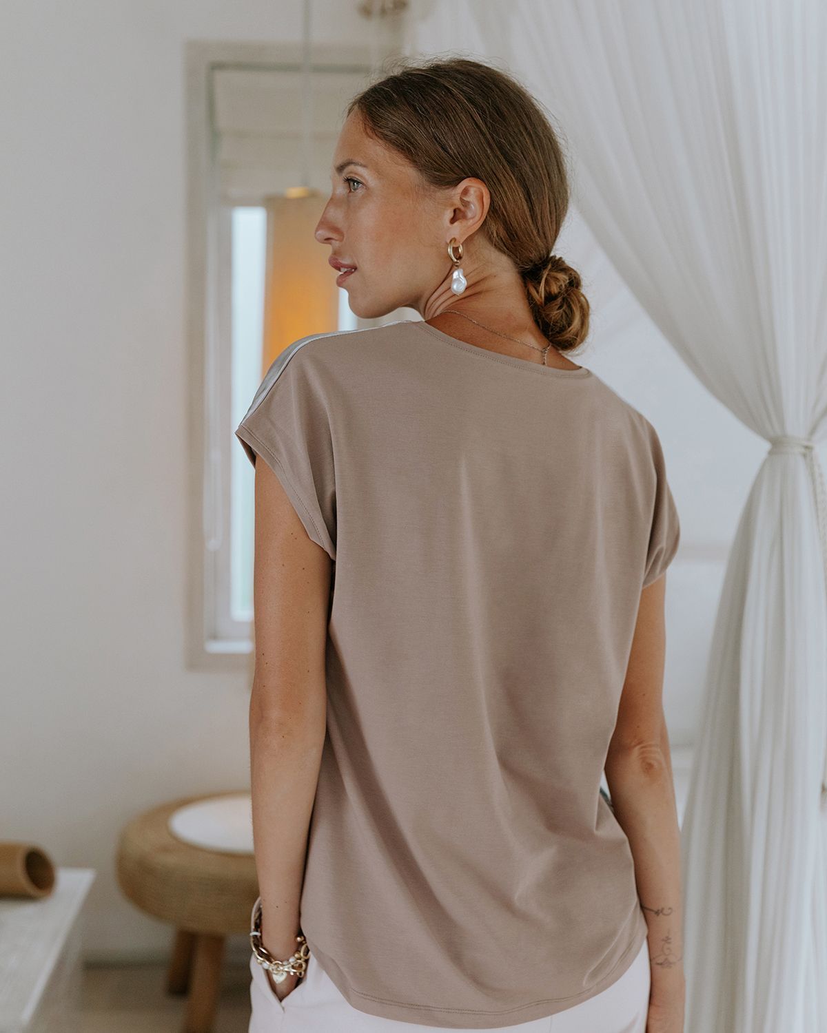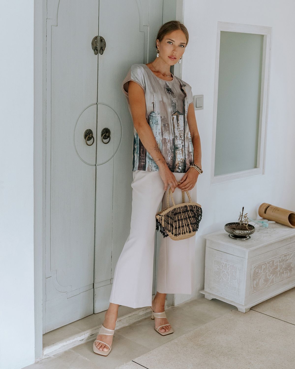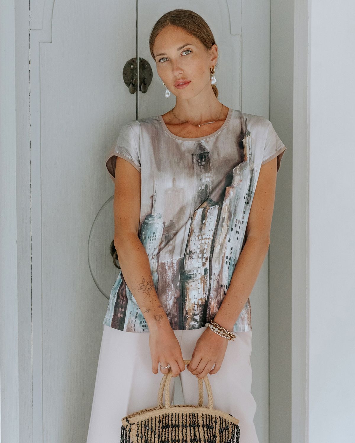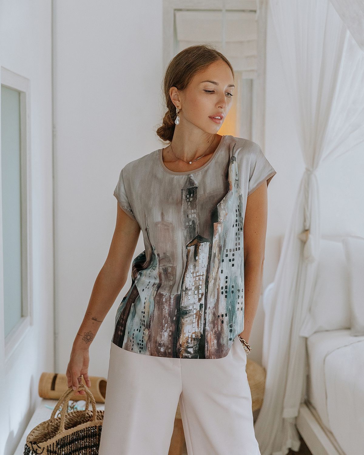 Спереди туника с принтом сделана из атласного шелка, который имеет благородный блеск. Спинка изделия - из эластичного трикотажа, который компенсирует то, что шёлк не тянущийся материал, и обеспечивает хорошую посадку.