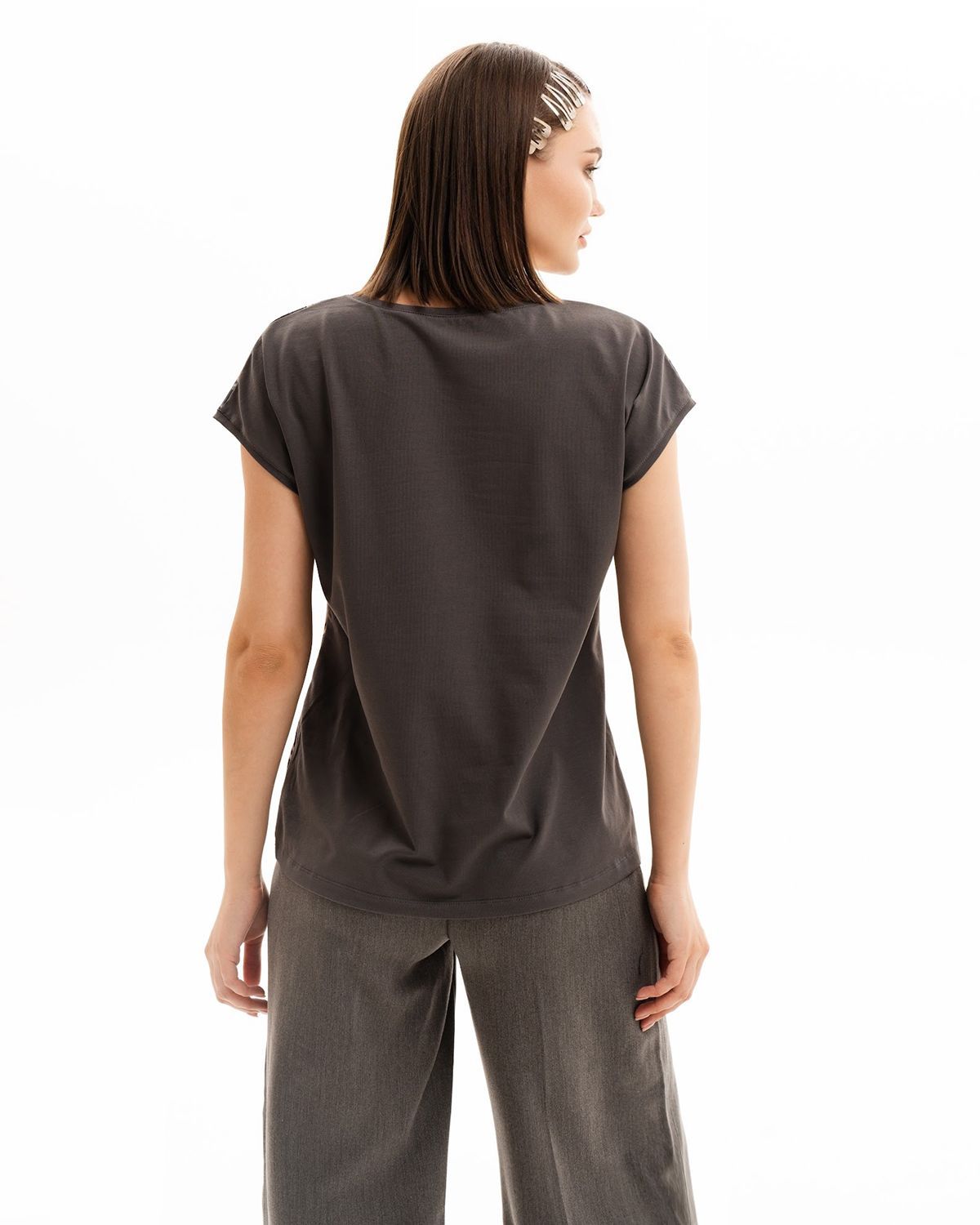 Спереди туника с принтом сделана из атласного шелка, который имеет благородный блеск. Спинка изделия - из эластичного трикотажа, который компенсирует то, что шёлк не тянущийся материал, и обеспечивает хорошую посадку.