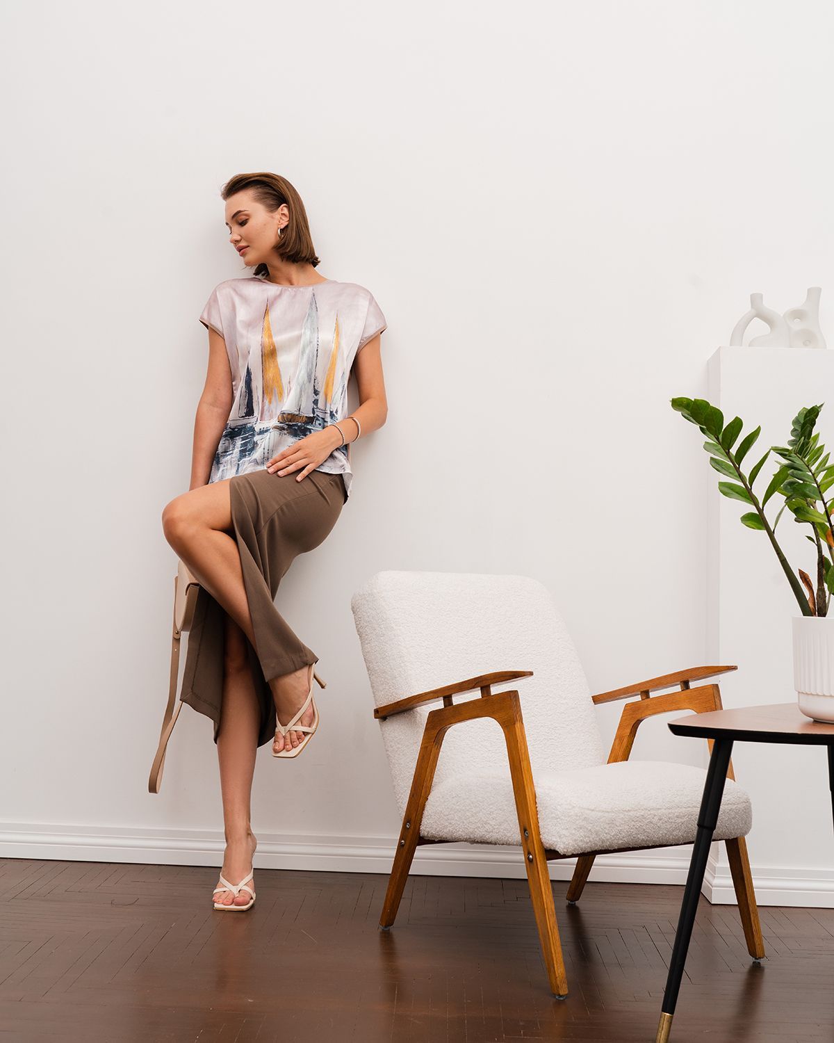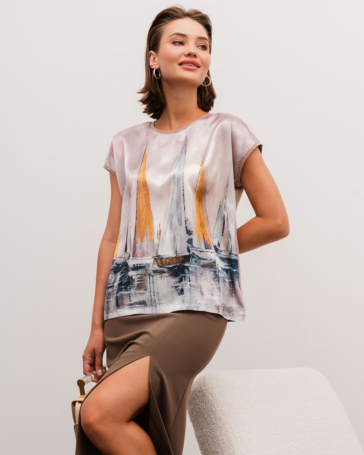 Спереди туника с принтом сделана из атласного шелка, который имеет благородный блеск. Спинка изделия - из эластичного трикотажа, который компенсирует то, что шёлк не тянущийся материал, и обеспечивает хорошую посадку.