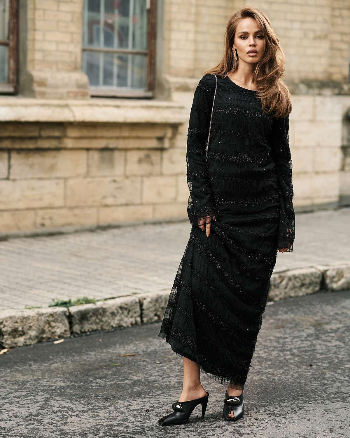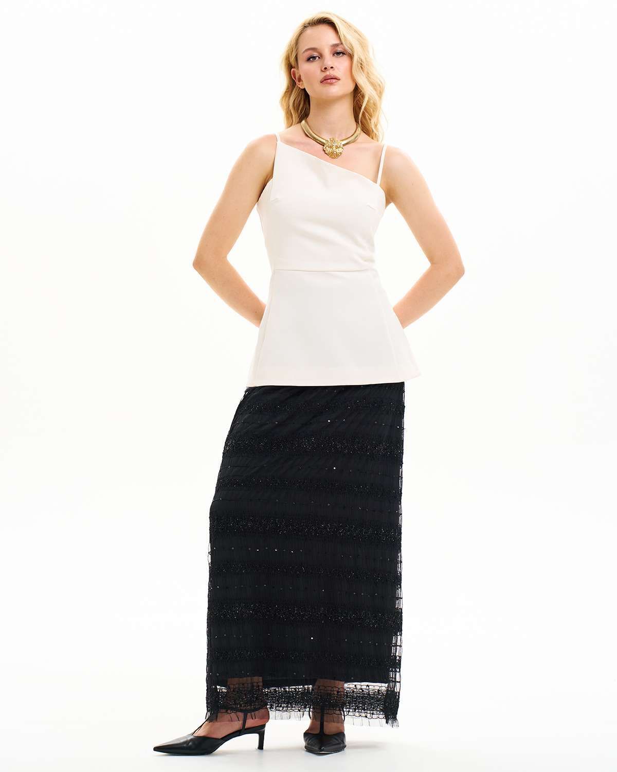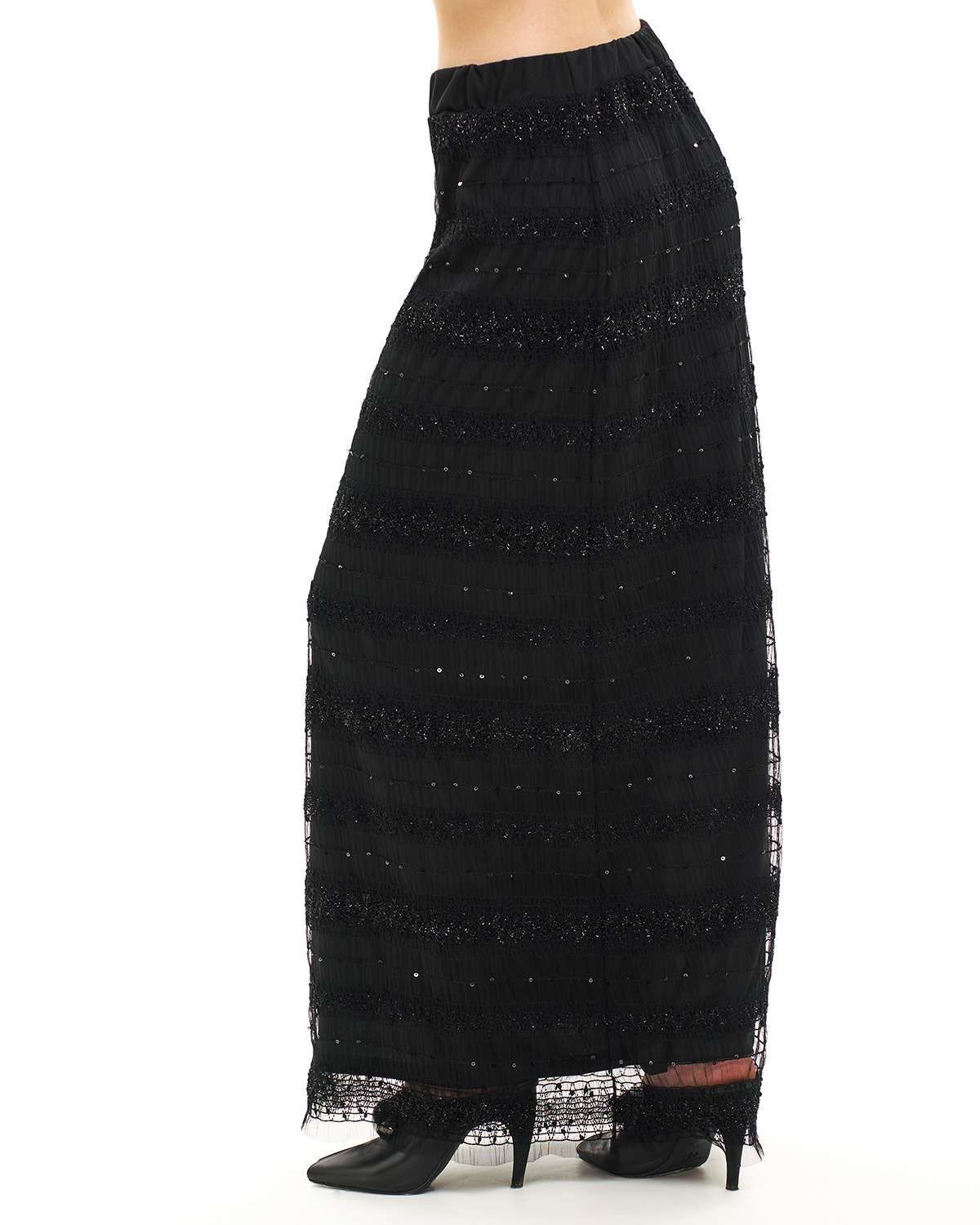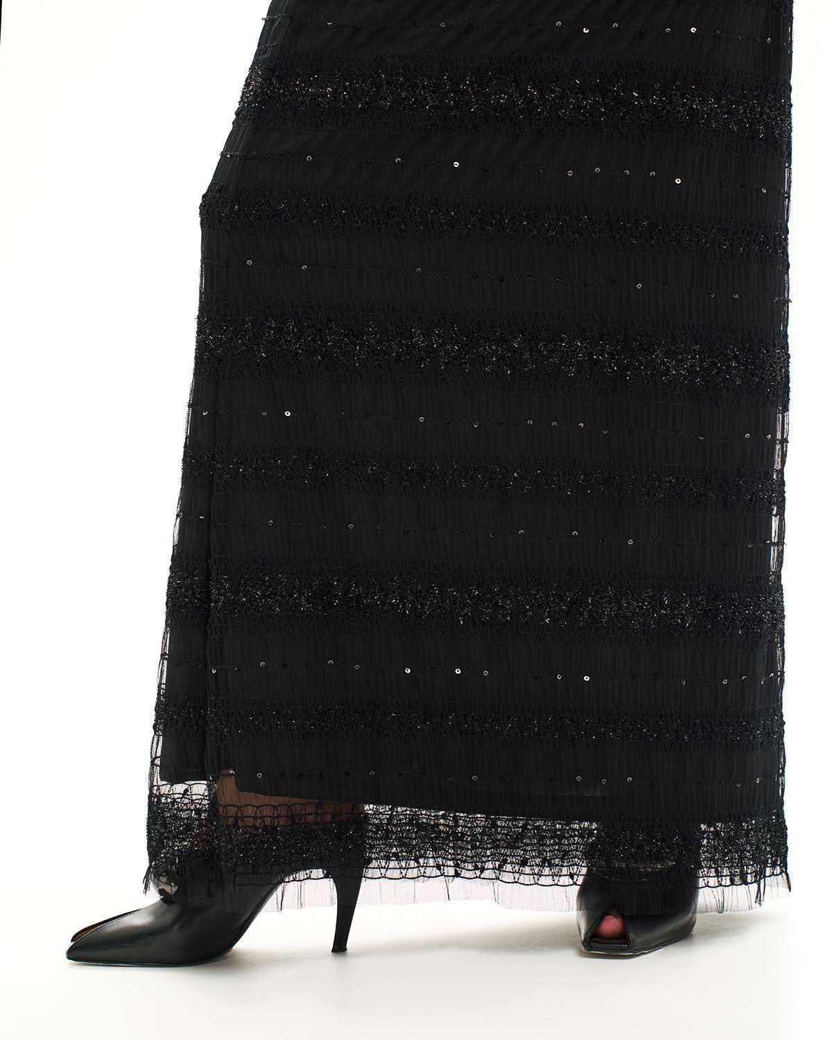 Вечерняя юбка макси в пол — идеальный выбор для создания эффектного образа. Эта нарядная модель выполнена в трендовом стиле, вдохновлённом лучшими идеями Pinterest. Длинная юбка из прозрачной сеточки с необычной объёмной текстурой и блестящими нитями придаёт особое сияние и элегантность, что особенно актуально для торжественных мероприятий. Внутренняя подкладка обеспечивает комфорт и уместную закрытость, сохраняя при этом воздушность и лёгкость изделия.