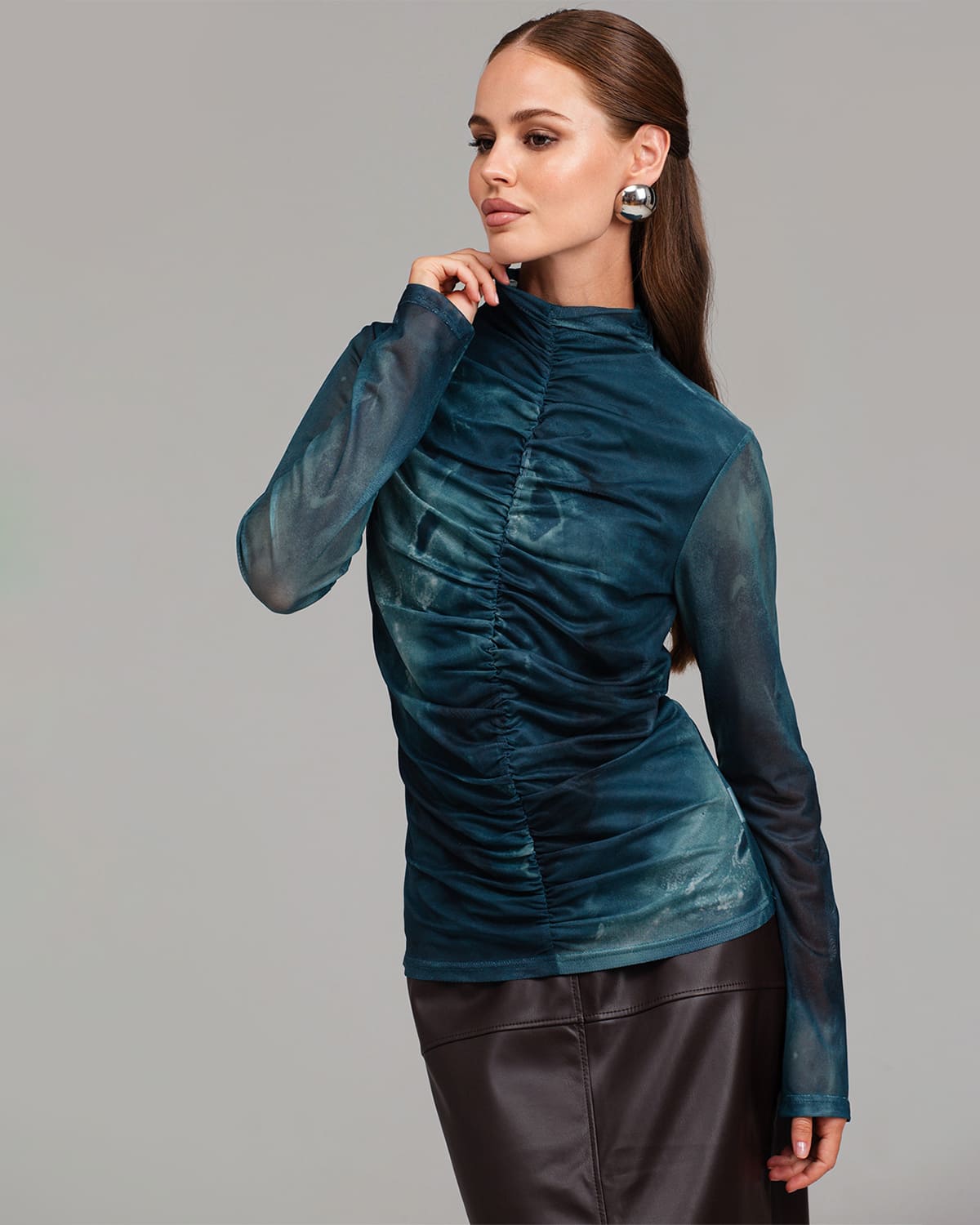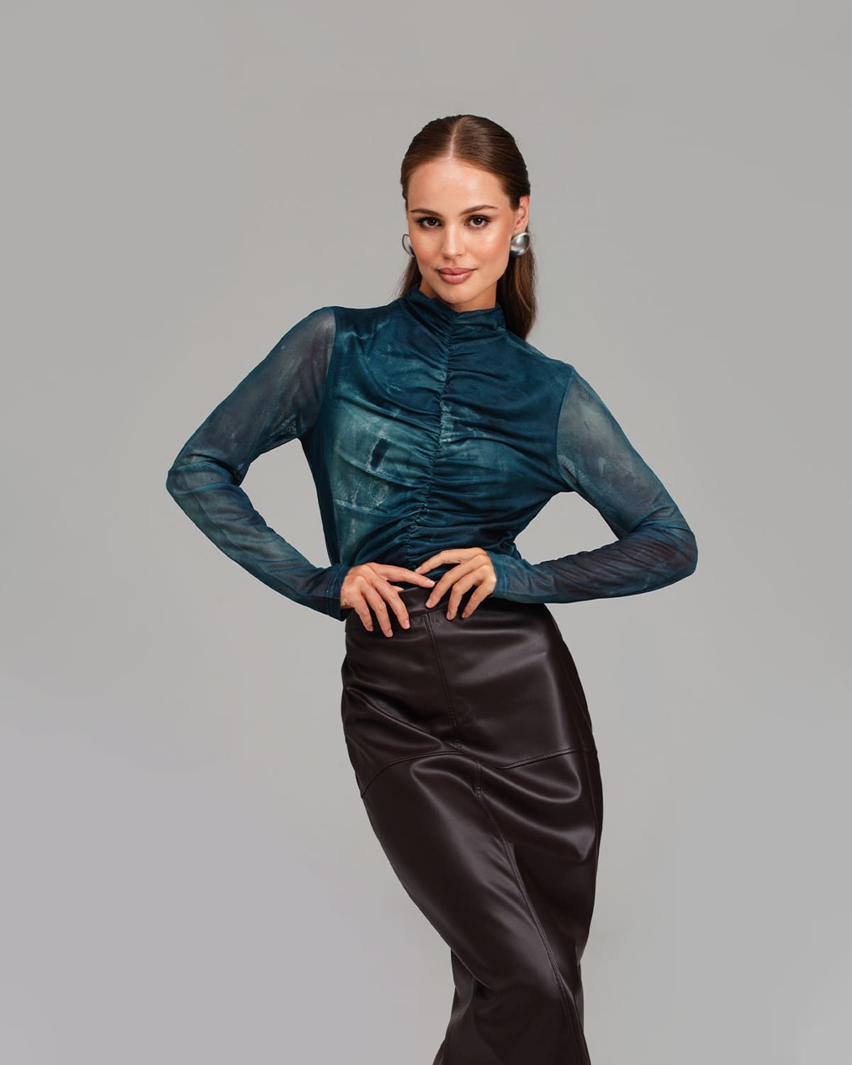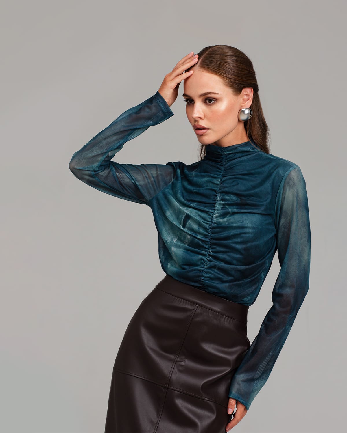 Водолазка из эластичной сетки с рельефами и сборкой - трендовый элемент гардероба для создания интересных многослойных образов. Облегающая подкладка впереди изделия делает водолазку не просвечивающейся и комфортной. Водолазка из сетчатой ткани очень приятна для тела. Она как будто воздушными нитями обволакивает кожу и практически не чувствуется. Материал мягкий и эластичный. Рельефы и сборка на ткани добавляют особый шарм и придают модели неповторимый стиль.